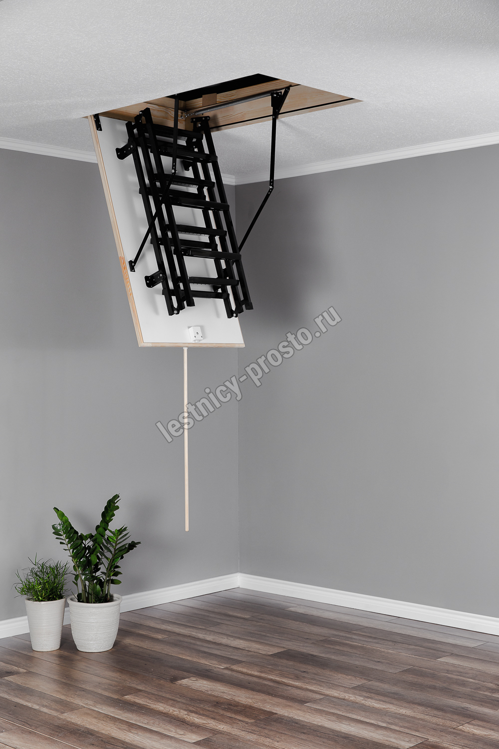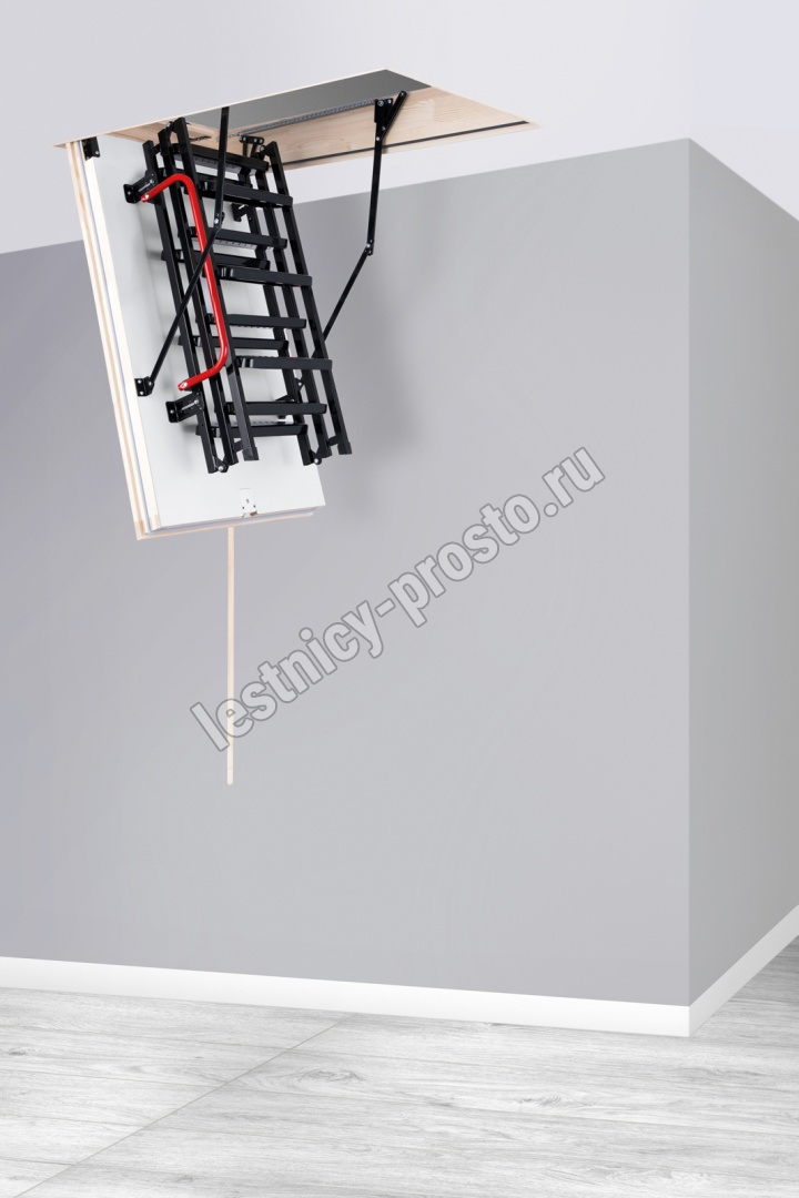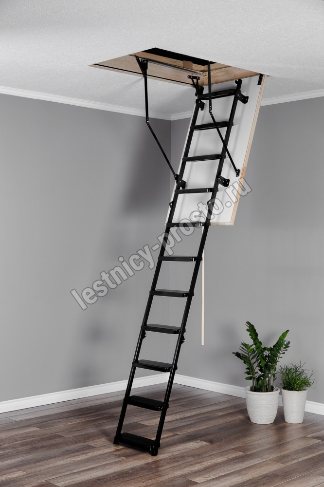 Лестница складная трехсекционная. Рабочая поверхность полностью выполнена из металла и покрашена порошковой краской. Термоизоляционная крышка типа "сэндвич", толщиной 86 мм, утеплена пенопластом, облицована с двух сторон ДCП белого цвета.