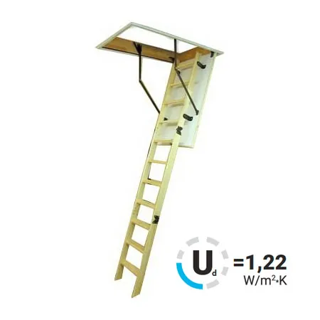 Лестница складная четырехсекционная, изготовлена из сосны. Термоизоляционная крышка типа "сэндвич" утеплена пенопластом, облицована с двух сторон ДСП белого цвета. Короб люка с уплотнителем. Все металлические элементы лестницы покрыты порошковой краской, ступени лестницы имеют антискользящие насечки и закреплены в столярное соединение «ласточкин хвост», что позволяет выдерживать нагрузку 150 кг. Деревянный стержень для открывания лестницы в комплекте.