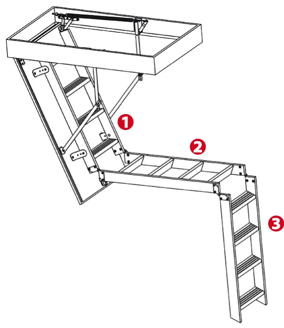 Лестница складная трёхсекционная, изготовлена из сосны. Термоизоляционная крышка типа "сэндвич" утеплена пенопластом, облицована с двух сторон ДСП белого цвета. Короб люка с однослойным уплотнителем. Все металлические элементы лестницы покрыты порошковой краской, ступени лестницы имеют антискользящие насечки и закреплены в столярное соединение «ласточкин хвост», что позволяет выдерживать нагрузку до 150 кг. Деревянный стержень для открывания лестницы в комплекте.