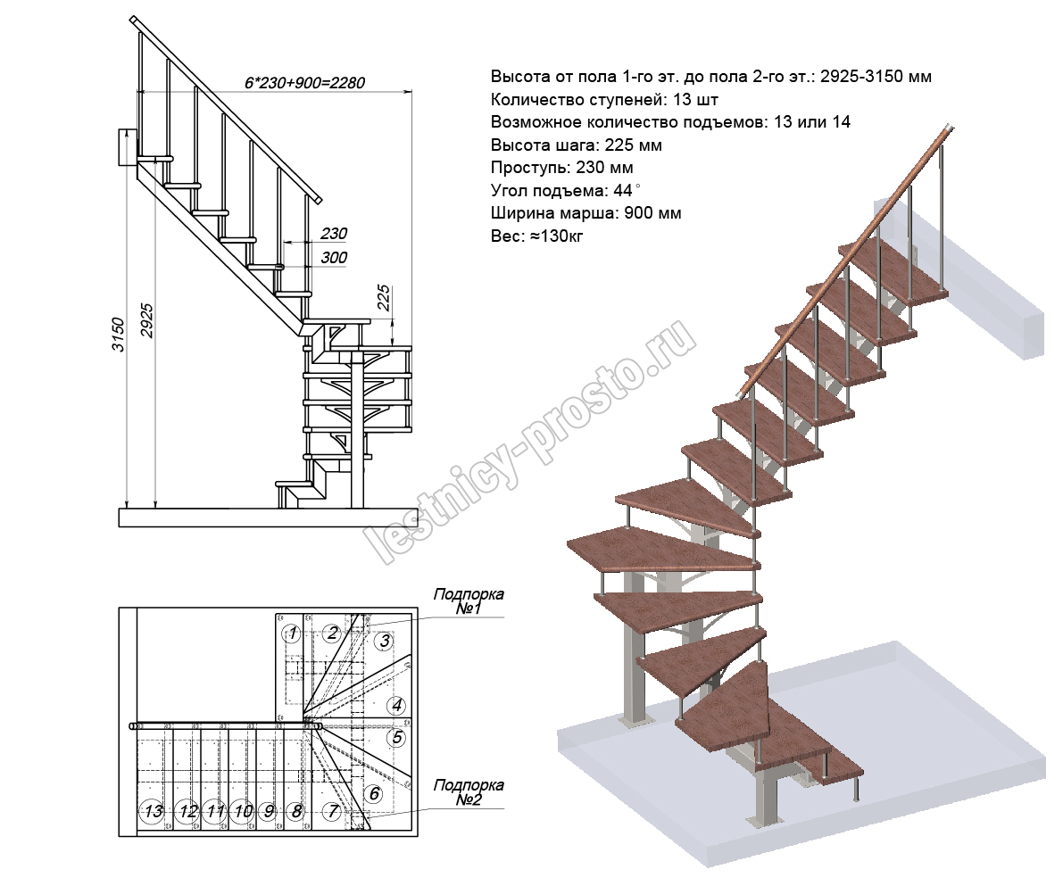 Высота лестницы 2925 - 3150 (13 ступеней) мм