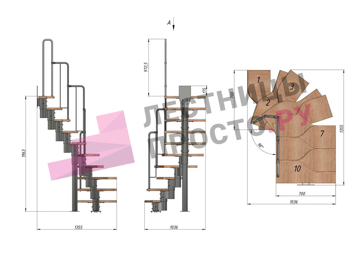 Лестница Prosto Urban Black гусиный шаг 700 мм, h180-264 см (10 ступеней), бук