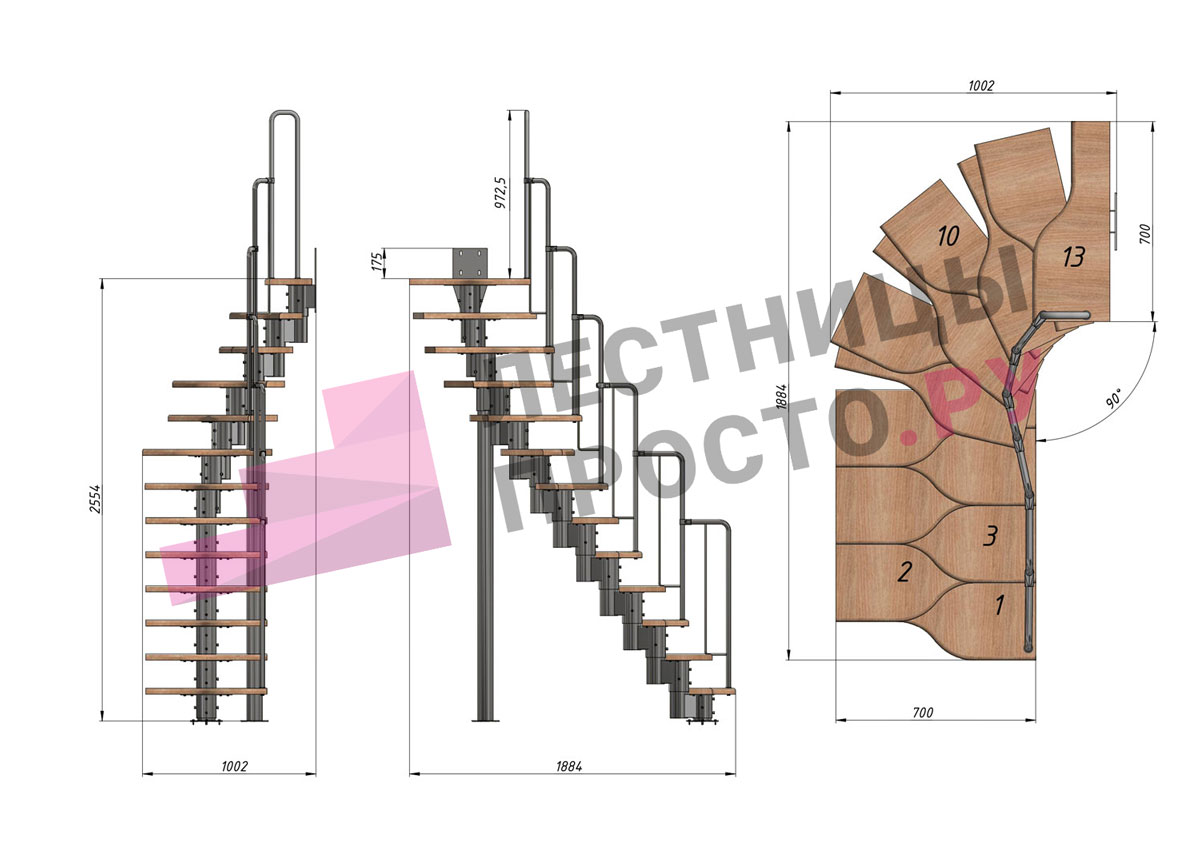 Лестница Prosto Urban Black гусиный шаг 700 мм, h234-336 см (13 ступеней), бук