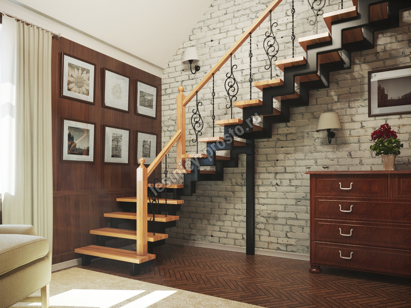 У данного варианта лестницы поворот реализован через забежные ступени. Под заказ возможно изготовление каркаса под поворотную площадку.