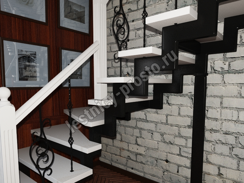 У данного варианта лестницы поворот реализован через забежные ступени. Под заказ возможно изготовление каркаса под поворотную площадку.