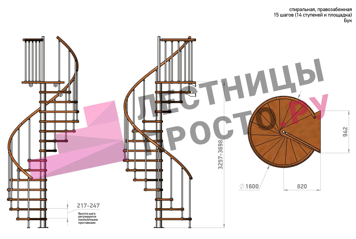 Ширина ступени между центральной колонной и поручнем ≈ 680 мм
