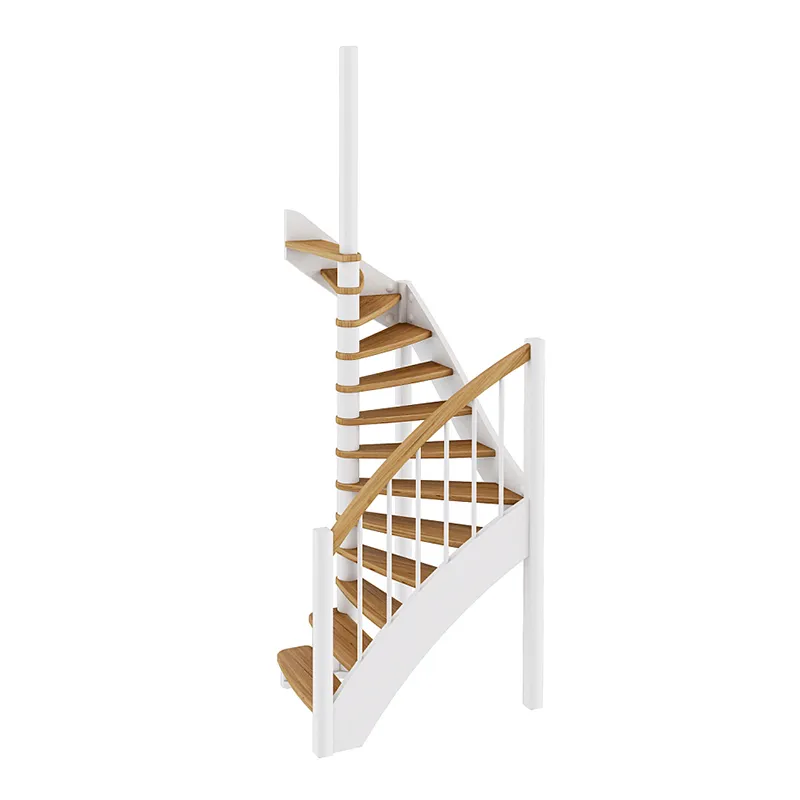 Ступени лестницы изготовлены из бука по технологии MULTIPLEX и покрыты износостойким защитным лаком. Лестница монтируется как по часовой стрелке, так и против. Возможен монтаж в круглый или квадратный проём. Ограждение: стальные трубки, Ø25 мм RAL 9006. Поручень: гибкий цельный ПВХ-поручень Ø40 мм серого цвета. Конструкция и балюстрада окрашены порошковым способом в серый цвет (RAL 9006).